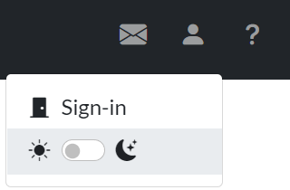 The person icon will open a pop-up to sign-in to your account; only a few pages require an account. Use the dark mode toggle to switch between dark and light mode.