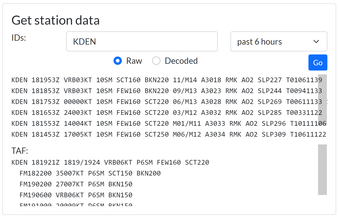 METAR/TAF/PIREP data: Print out unformatted data for a certain location.