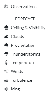 The weather dropdown menu will direct the user to the the Graphical Forecasts for Aviation (GFA) interactive map. Once viewing the GFA, the user can select other parameters and adjust settings on the map. For more information on the GFA, please view the GFA Help page.
